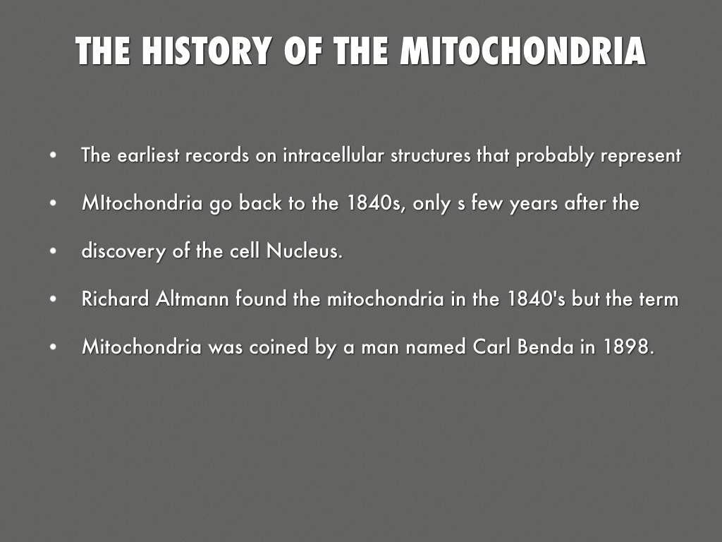 • MItochondria go back to the 1840s, only s few years after the