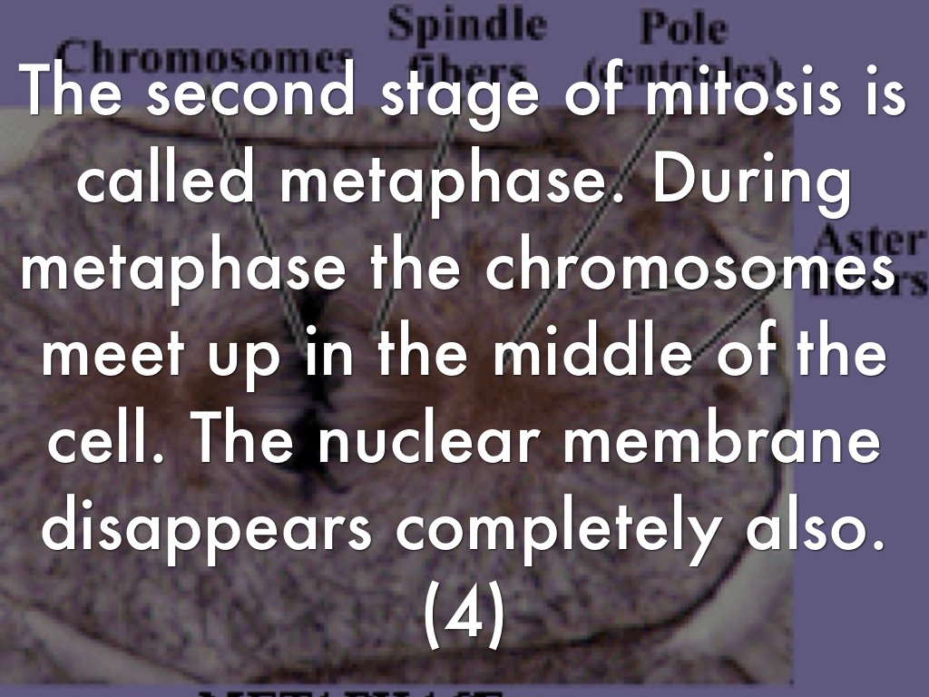 The second stage of mitosis is called metaphase. During metaphase the chromosomes meet up in the middle of the cell. The nuclear membrane disappears completely also.(4)