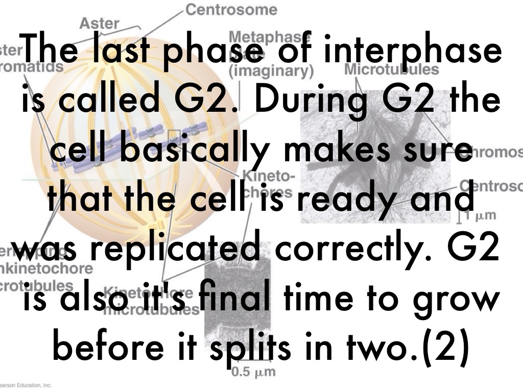 The last phase of interphase is called G2. During G2 the cell basically makes sure that the cell is ready and was replicated correctly. G2 is also it's final time to grow before it splits in two.(2)