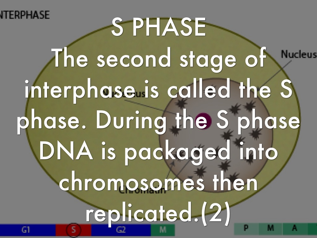 The second stage of interphase is called the S phase. During the S phase DNA is packaged into chromosomes then replicated.(2)