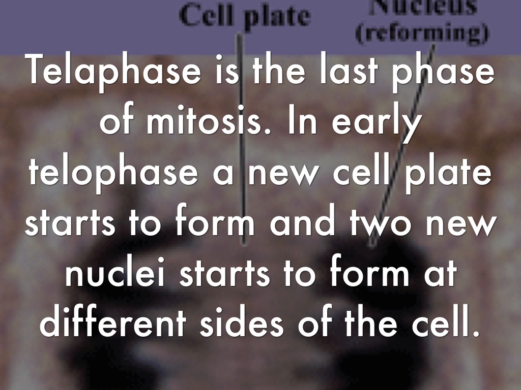 Telaphase is the last phase of mitosis. In early telophase a new cell plate starts to form and two new nuclei starts to form at different sides of the cell.