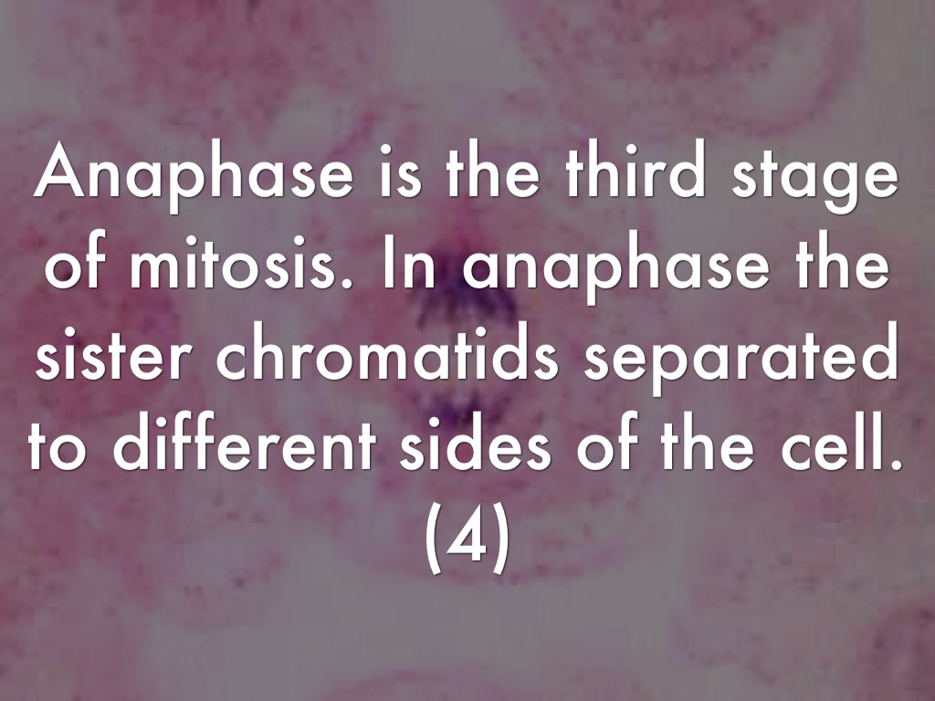 Anaphase is the third stage of mitosis. In anaphase the sister chromatids separated to different sides of the cell.(4)