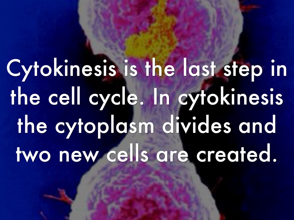 Cytokinesis is the last step in the cell cycle. In cytokinesis the cytoplasm divides and two new cells are created.