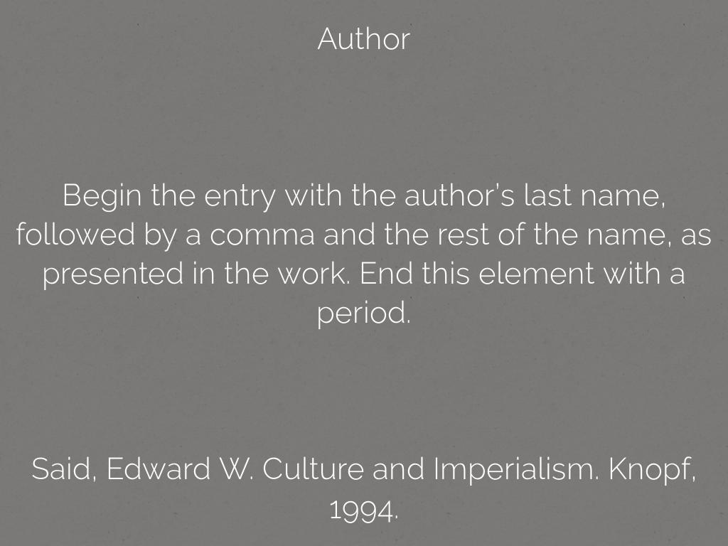 Begin the entry with the author’s last name, followed by a comma and the rest of the name, as presented in the work. End this element with a period.