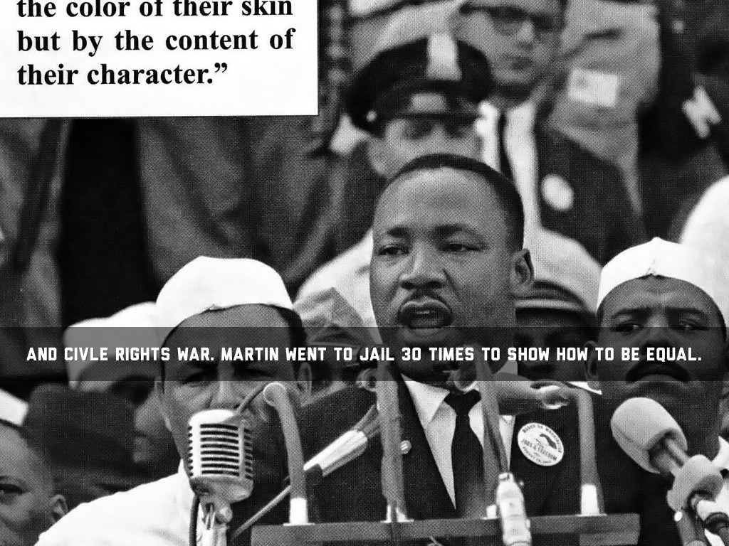 AND CIVLE RIGHTS WAR. MARTIN WENT TO JAIL 30 TIMES TO SHOW HOW TO BE EQUAL.