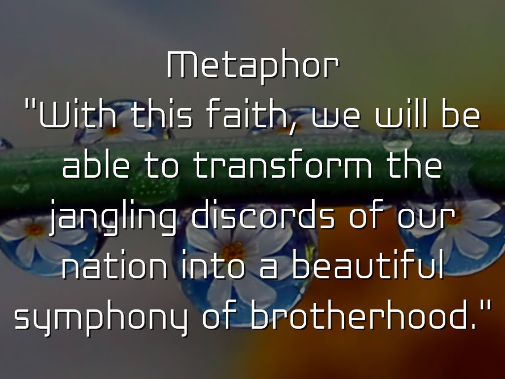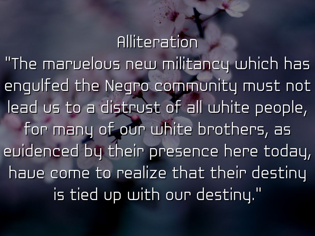 Alliteration "The marvelous new militancy which has engulfed the Negro community must not lead us to a distrust of all white people, for many of our white brothers, as evidenced by their presence here today, have come to realize that their destiny is tied up with our destiny."