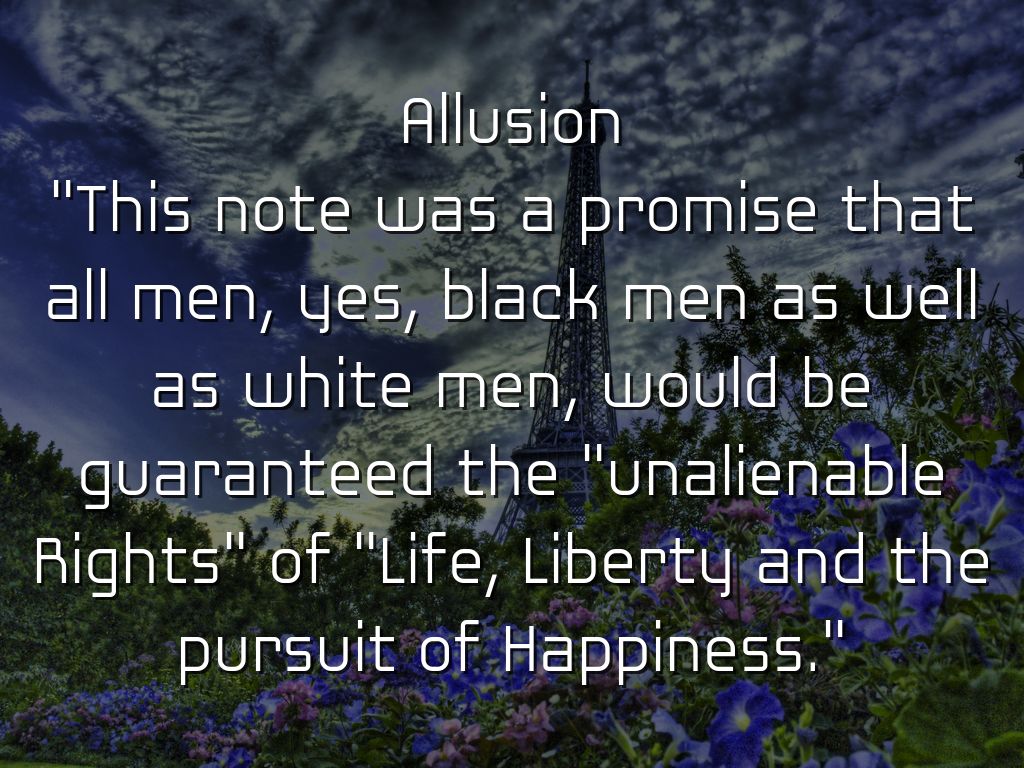 Allusion "This note was a promise that all men, yes, black men as well as white men, would be guaranteed the "unalienable Rights" of "Life, Liberty and the pursuit of Happiness."