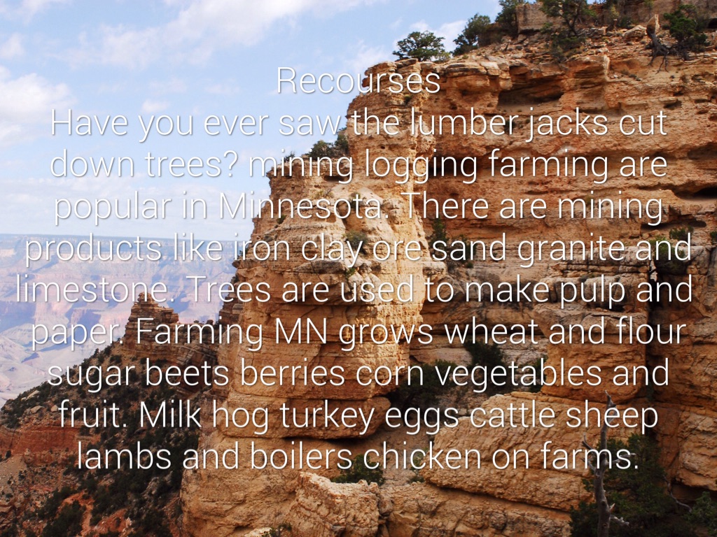 Recourses Have you ever saw the lumber jacks cut down trees? mining logging farming are popular in Minnesota. There are mining products like iron clay ore sand granite and limestone. Trees are used to make pulp and paper. Farming MN grows wheat and flour sugar beets berries corn vegetables and fruit. Milk hog turkey eggs cattle sheep lambs and boilers chicken on farms.