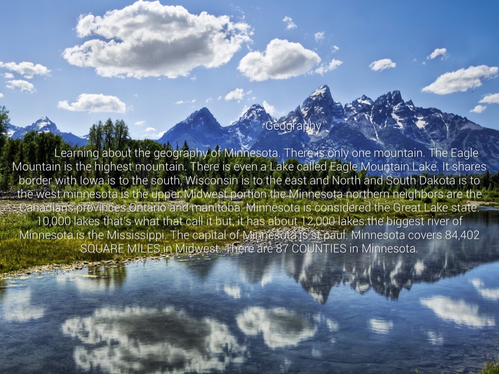 Learning about the geography of Minnesota. There is only one mountain. The Eagle Mountain is the highest mountain. There is even a Lake called Eagle Mountain Lake. It shares border with Iowa is to the south, Wisconsin is to the east and North and South Dakota is to the west.minnesota is the upper Midwest portion the Minnesota northern neighbors are the Canadians provinces Ontario and manitoba. Minnesota is considered the Great Lake state. 10,000 lakes that's what that call it but, it has about 12,000 lakes.the biggest river of Minnesota is the Mississippi. The capital of Minnesota is st.paul. Minnesota covers 84,402 SQUARE MILES in Midwest. There are 87 COUNTIES in Minnesota.