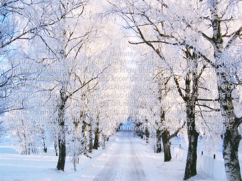 Climate Burr,it is cold out. Did you know that Minnesota has 19-32 inches of snow and rain in Minnesota. Did you also know that the coldest temperature is 59°F in Minnesota. Did you also know that the hottest TEMPURTURE is 114°F in Minnesota. Also did you know that thunderstorms with hail are common in May and September.also did you know that the 4 seasons in Minnesota are summer, spring, fall, and winter. Did you also know that tornados whirl around in Minnesota during warm months. Have you ever been in traffic during the winter? Well, it is because there has been at least 4 inches of snow a year. And did you know that winter often drops to 0°F.