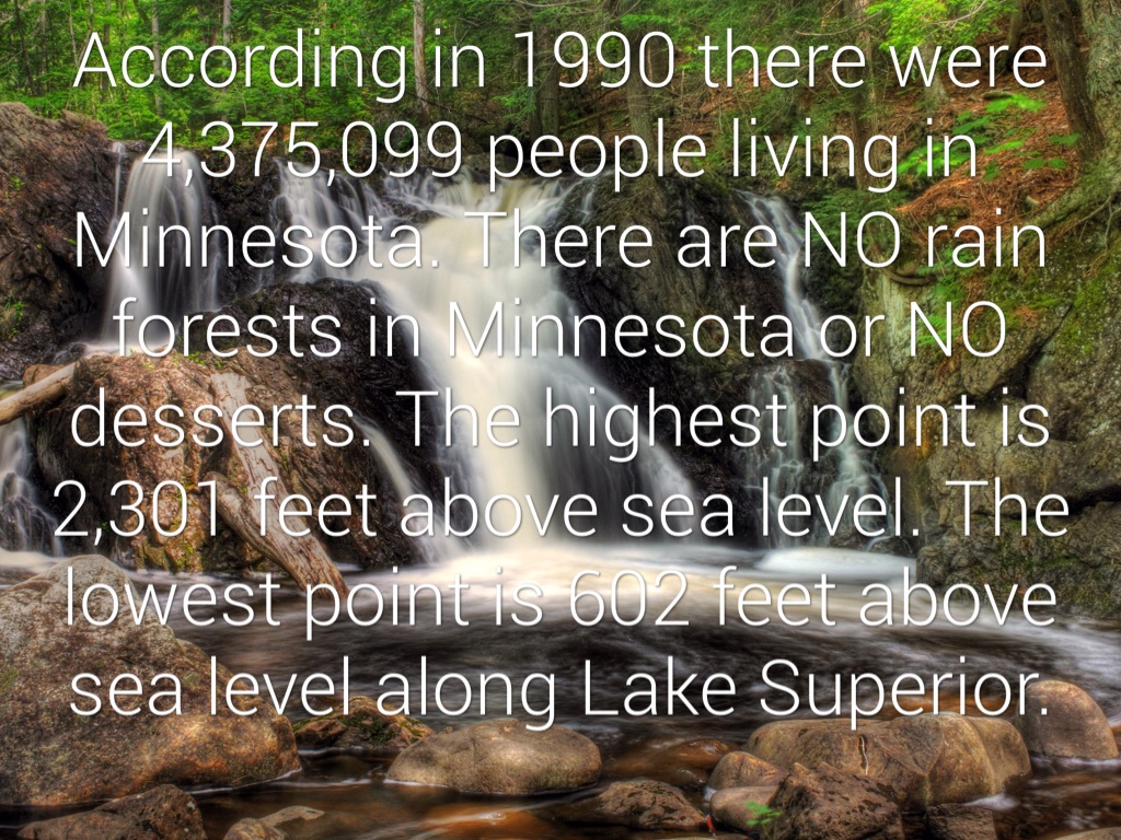 According in 1990 there were 4,375,099 people living in Minnesota. There are NO rain forests in Minnesota or NO desserts. The highest point is 2,301 feet above sea level. The lowest point is 602 feet above sea level along Lake Superior.