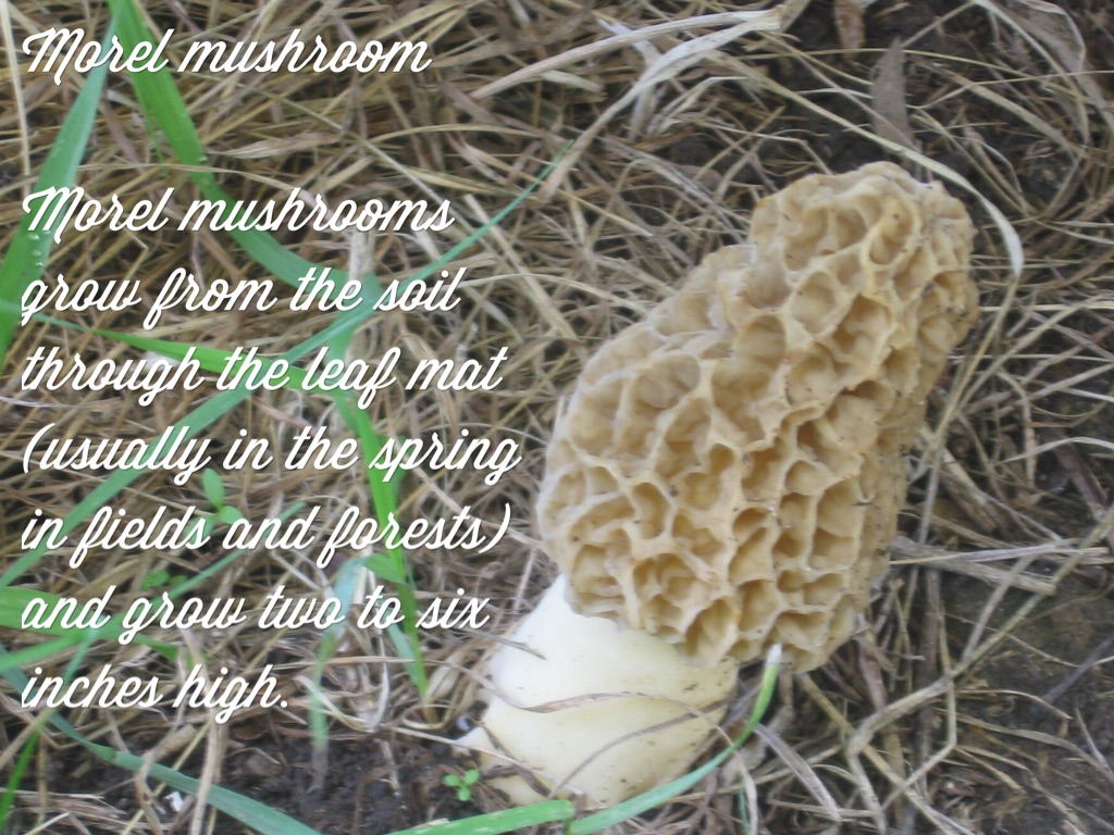Morel mushrooms grow from the soil through the leaf mat (usually in the spring in fields and forests) and grow two to six inches high.
