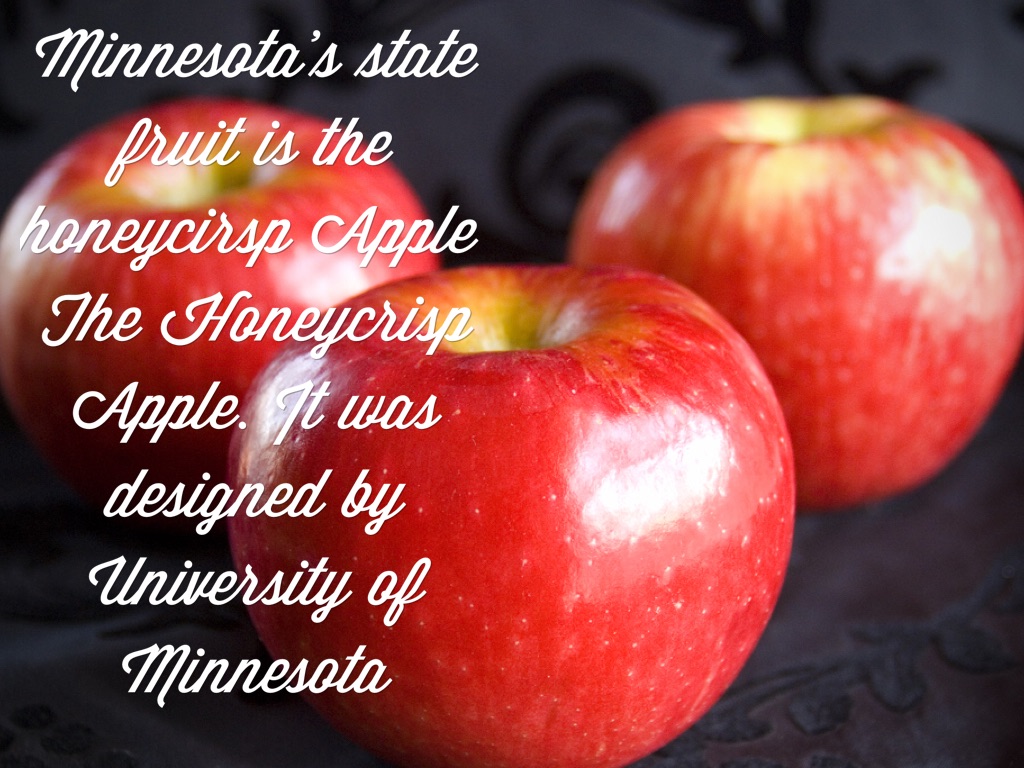 Minnesota's state fruit is the honeycirsp Apple The Honeycrisp Apple. It was designed by University of Minnesota