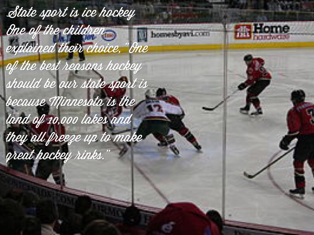 State sport is ice hockey One of the children explained their choice, "One of the best reasons hockey should be our state sport is because Minnesota is the land of 10,000 lakes and they all freeze up to make great hockey rinks."