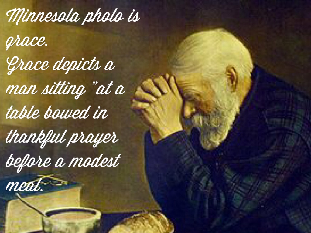 Grace depicts a man sitting "at a table bowed in thankful prayer before a modest meal.