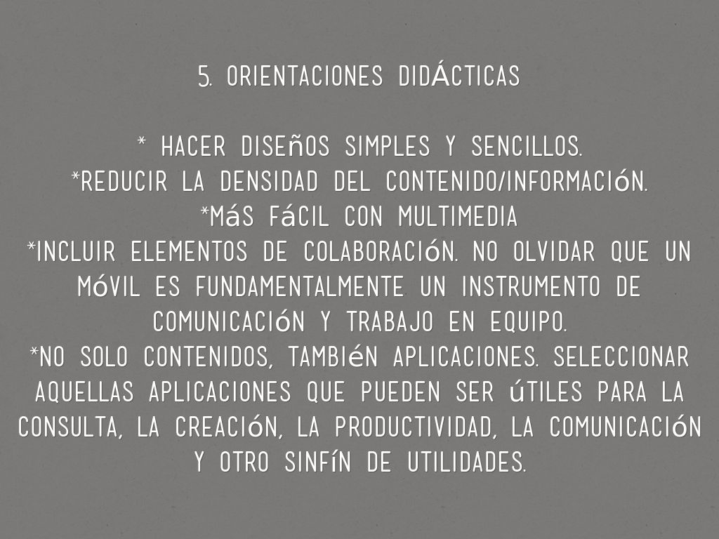 * Hacer diseños simples y sencillos. *Reducir la densidad del contenido/información. *Más fácil con multiMEDIA *Incluir elementos de colaboración. No olvidar que un móvil es fundamentalmente un instrumento de comunicación y trabajo en equipo. *No solo contenidos, también aplicaciones. Seleccionar aquellas aplicaciones que pueden ser útiles para la consulta, la creación, la productividad, la comunicación y otro sinfín de utilidades.