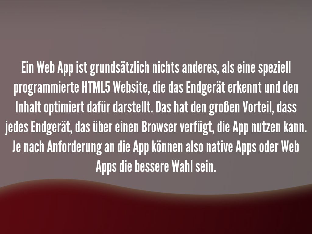 Ein Web App ist grundsätzlich nichts anderes, als eine speziell programmierte HTML5 Website, die das Endgerät erkennt und den Inhalt optimiert dafür darstellt. Das hat den großen Vorteil, dass jedes Endgerät, das über einen Browser verfügt, die App nutzen kann. Je nach Anforderung an die App können also native Apps oder Web Apps die bessere Wahl sein.