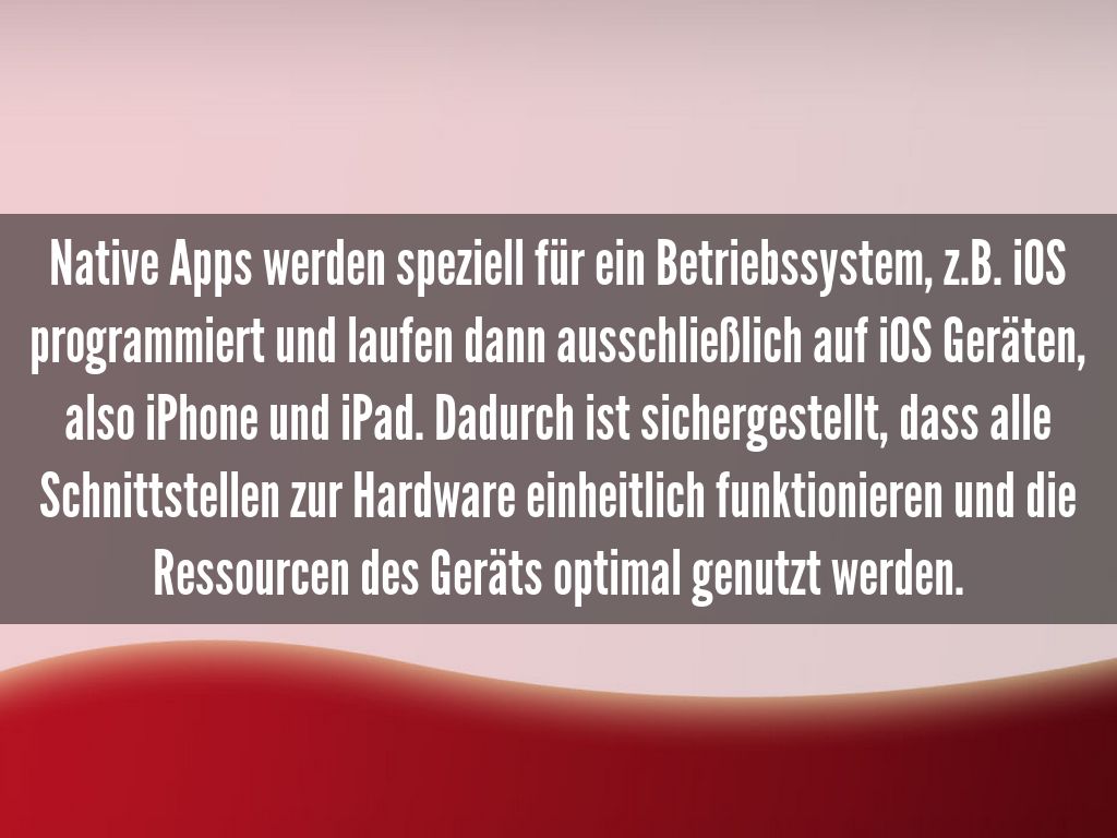 Native Apps werden speziell für ein Betriebssystem, z.B. iOS programmiert und laufen dann ausschließlich auf iOS Geräten, also iPhone und iPad. Dadurch ist sichergestellt, dass alle Schnittstellen zur Hardware einheitlich funktionieren und die Ressourcen des Geräts optimal genutzt werden.