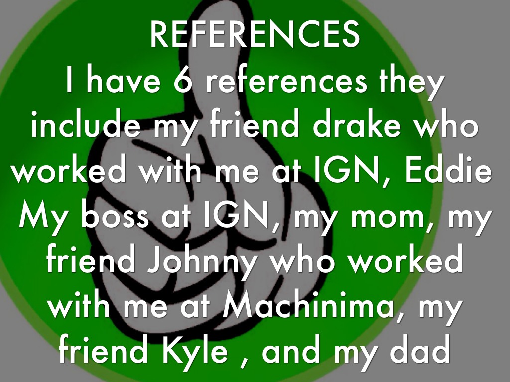 REFERENCES I have 6 references they include my friend drake who worked with me at IGN, Eddie My boss at IGN, my mom, my friend Johnny who worked with me at Machinima, my friend Kyle , and my dad