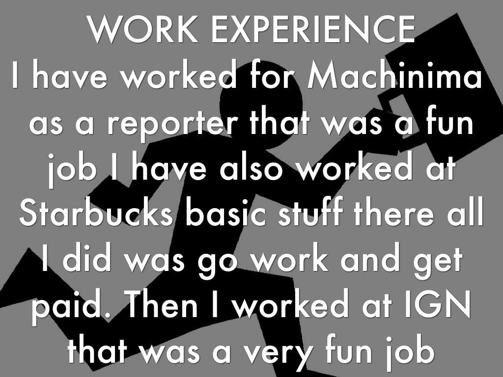 WORK EXPERIENCE I have worked for Machinima as a reporter that was a fun job I have also worked at Starbucks basic stuff there all I did was go work and get paid. Then I worked at IGN that was a very fun job