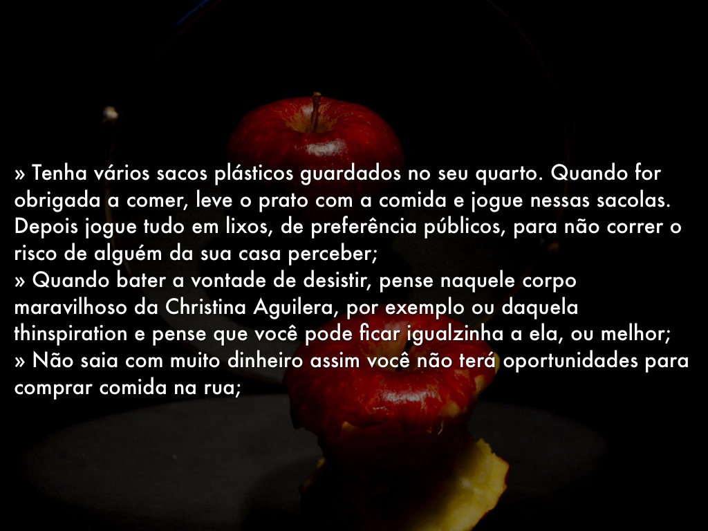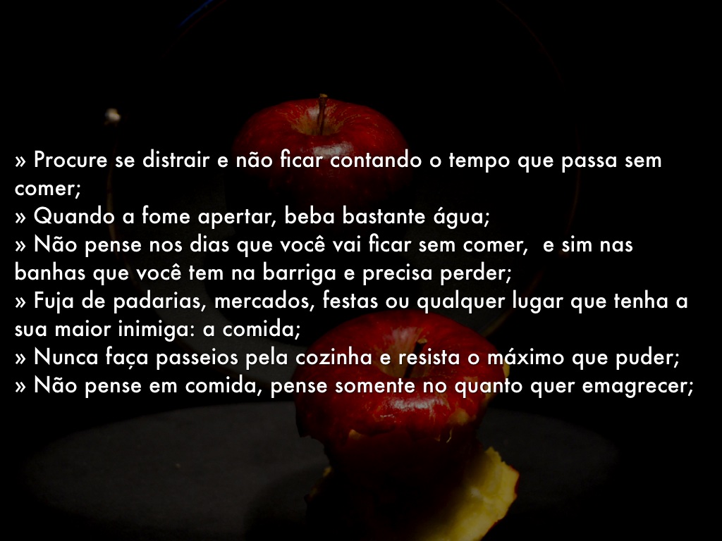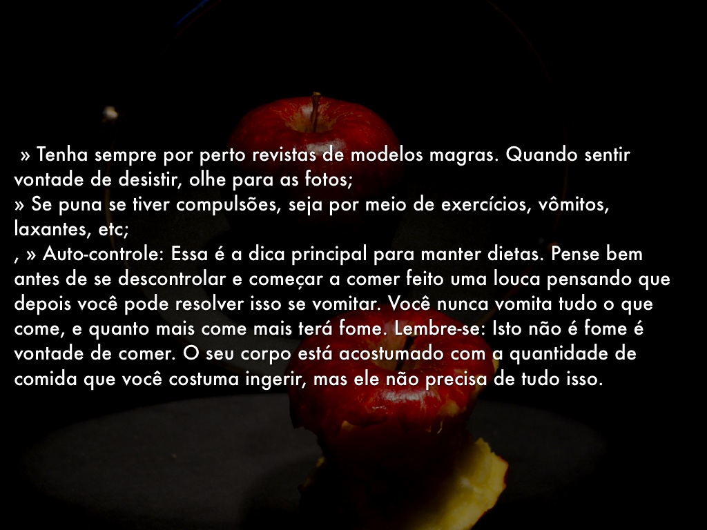 , » Auto-controle: Essa é a dica principal para manter dietas. Pense bem antes de se descontrolar e começar a comer feito uma louca pensando que depois você pode resolver isso se vomitar. Você nunca vomita tudo o que come, e quanto mais come mais terá fome. Lembre-se: Isto não é fome é vontade de comer. O seu corpo está acostumado com a quantidade de comida que você costuma ingerir, mas ele não precisa de tudo isso.