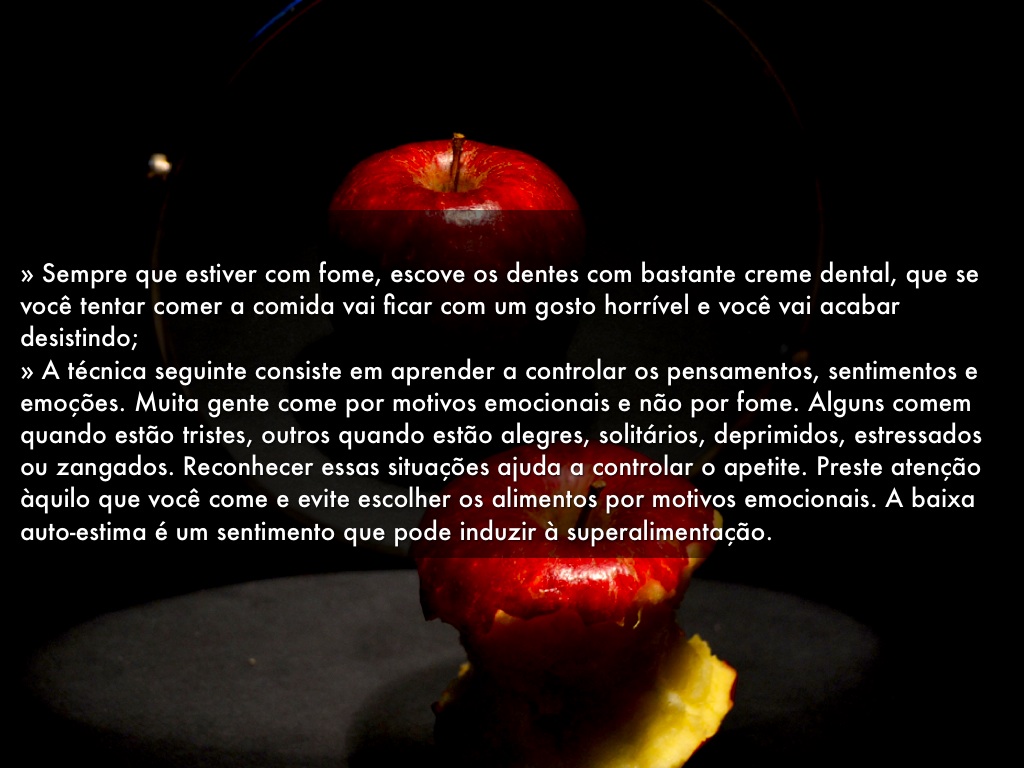 » A técnica seguinte consiste em aprender a controlar os pensamentos, sentimentos e emoções. Muita gente come por motivos emocionais e não por fome. Alguns comem quando estão tristes, outros quando estão alegres, solitários, deprimidos, estressados ou zangados. Reconhecer essas situações ajuda a controlar o apetite. Preste atenção àquilo que você come e evite escolher os alimentos por motivos emocionais. A baixa auto-estima é um sentimento que pode induzir à superalimentação.