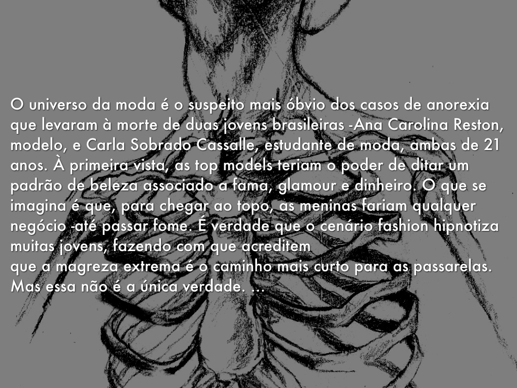 O universo da moda é o suspeito mais óbvio dos casos de anorexia que levaram à morte de duas jovens brasileiras -Ana Carolina Reston, modelo, e Carla Sobrado Cassalle, estudante de moda, ambas de 21 anos. À primeira vista, as top models teriam o poder de ditar um padrão de beleza associado a fama, glamour e dinheiro. O que se imagina é que, para chegar ao topo, as meninas fariam qualquer negócio -até passar fome. É verdade que o cenário fashion hipnotiza muitas jovens, fazendo com que acreditem