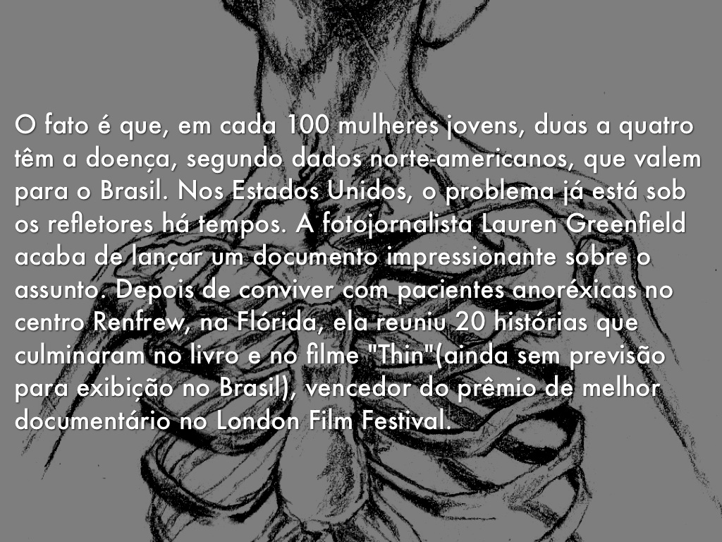 O fato é que, em cada 100 mulheres jovens, duas a quatro têm a doença, segundo dados norte-americanos, que valem para o Brasil. Nos Estados Unidos, o problema já está sob os refletores há tempos. A fotojornalista Lauren Greenfield acaba de lançar um documento impressionante sobre o assunto. Depois de conviver com pacientes anoréxicas no centro Renfrew, na Flórida, ela reuniu 20 histórias que culminaram no livro e no filme "Thin"(ainda sem previsão para exibição no Brasil), vencedor do prêmio de melhor documentário no London Film Festival.