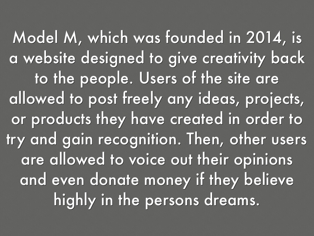 Model M, which was founded in 2014, is a website designed to give creativity back to the people. Users of the site are allowed to post freely any ideas, projects, or products they have created in order to try and gain recognition. Then, other users are allowed to voice out their opinions and even donate money if they believe highly in the persons dreams.
