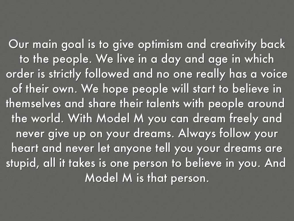 Our main goal is to give optimism and creativity back to the people. We live in a day and age in which order is strictly followed and no one really has a voice of their own. We hope people will start to believe in themselves and share their talents with people around the world. With Model M you can dream freely and never give up on your dreams. Always follow your heart and never let anyone tell you your dreams are stupid, all it takes is one person to believe in you. And Model M is that person.