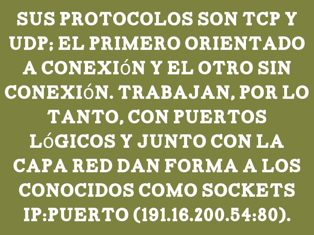 Sus protocolos son TCP y UDP; el primero orientado a conexión y el otro sin conexión. Trabajan, por lo tanto, con puertos lógicos y junto con la capa red dan forma a los conocidos como Sockets IP:Puerto (191.16.200.54:80).