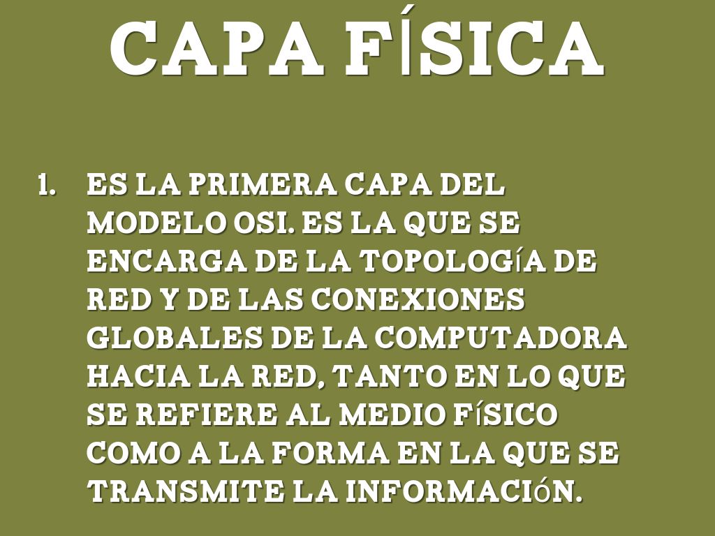 - Es la primera capa del Modelo OSI. Es la que se encarga de la topología de red y de las conexiones globales de la computadora hacia la red, tanto en lo que se refiere al medio físico como a la forma en la que se transmite la información.