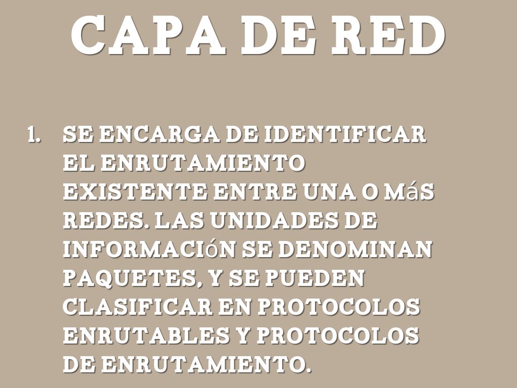 - Se encarga de identificar el enrutamiento existente entre una o más redes. Las unidades de información se denominan paquetes, y se pueden clasificar en protocolos enrutables y protocolos de enrutamiento.