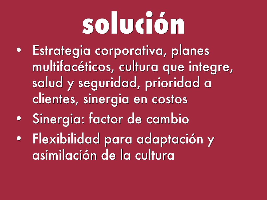- Estrategia corporativa, planes multifacéticos, cultura que integre, salud y seguridad, prioridad a clientes, sinergia en costos