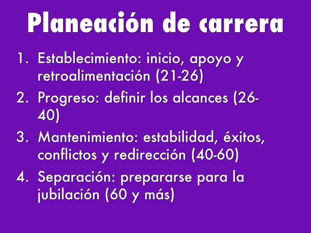 - Mantenimiento: estabilidad, éxitos, conflictos y redirección (40-60)
