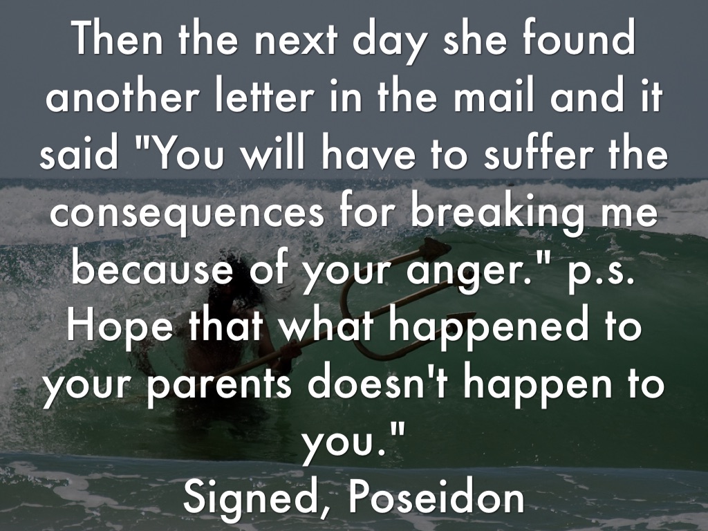 Then the next day she found another letter in the mail and it said "You will have to suffer the consequences for breaking me because of your anger." p.s. Hope that what happened to your parents doesn't happen to you." Signed, Poseidon