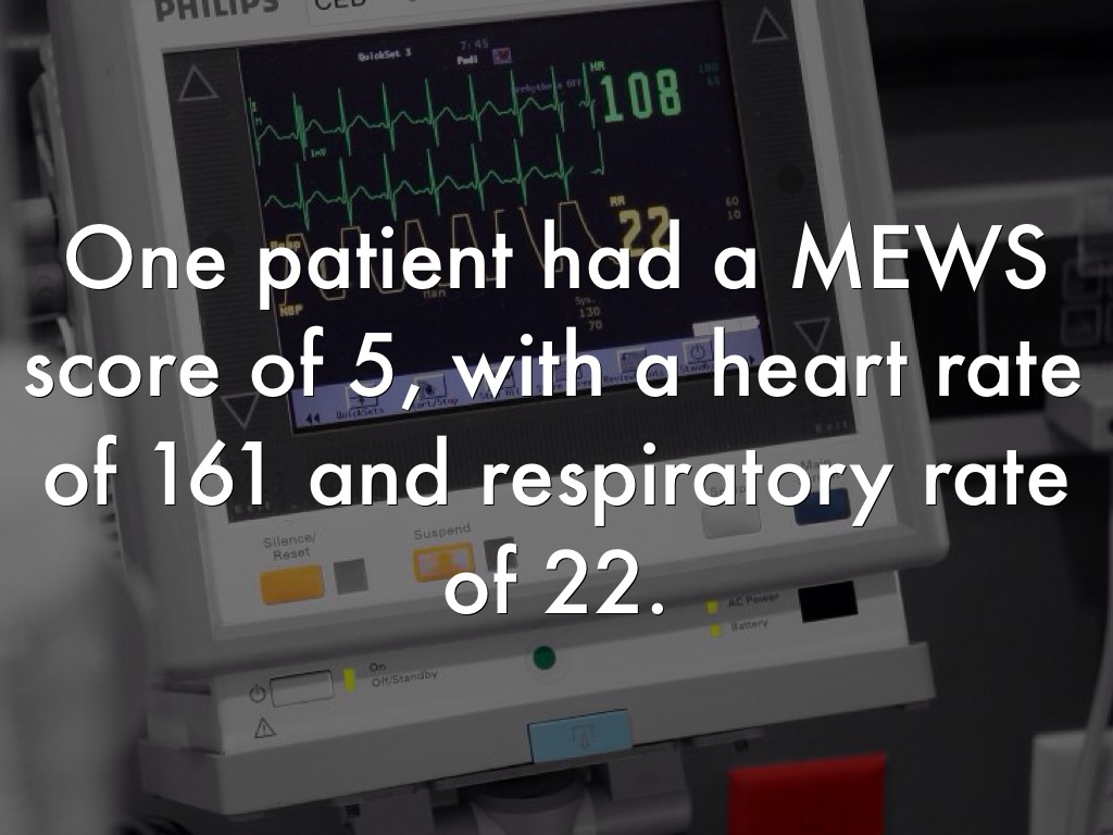 One patient had a MEWS score of 5, with a heart rate of 161 and respiratory rate of 22.