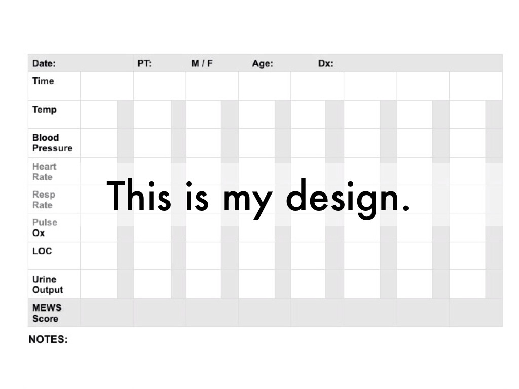 This is the chart that I created to keep track of my patients for this project. I wrote the MEWS score in the grey column. The "notes" section about any interventions (or why no interventions were deemed necessary). For the purpose of convenience, I had two charts per page.