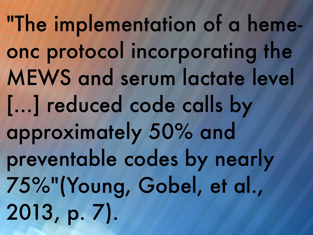 "The implementation of a heme-onc protocol incorporating the MEWS and serum lactate level [...] reduced code calls by approximately 50% and preventable codes by nearly 75%"(Young, Gobel, et al., 2013, p. 7).