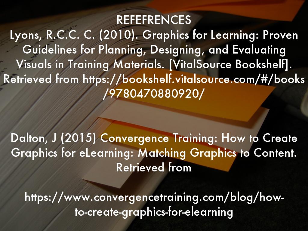 REFEFRENCES Lyons, R.C.C. C. (2010). Graphics for Learning: Proven Guidelines for Planning, Designing, and Evaluating Visuals in Training Materials. [VitalSource Bookshelf]. Retrieved from https://bookshelf.vitalsource.com/#/books/9780470880920/