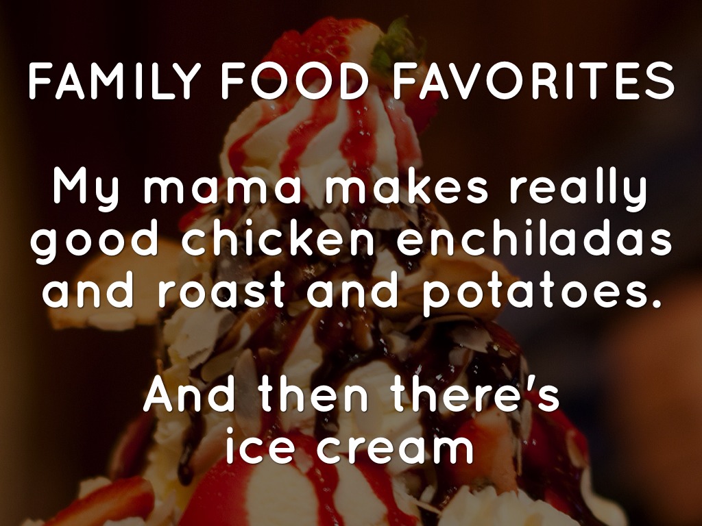 My mama makes really good chicken enchiladas and roast and potatoes.