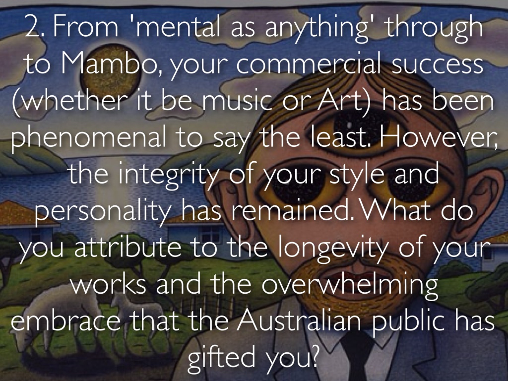2. From 'mental as anything' through to Mambo, your commercial success (whether it be music or Art) has been phenomenal to say the least. However, the integrity of your style and personality has remained. What do you attribute to the longevity of your works and the overwhelming embrace that the Australian public has gifted you?
