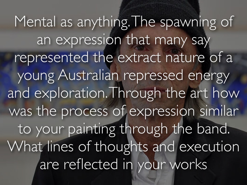 Mental as anything. The spawning of an expression that many say represented the extract nature of a young Australian repressed energy and exploration. Through the art how was the process of expression similar to your painting through the band. What lines of thoughts and execution are reflected in your works