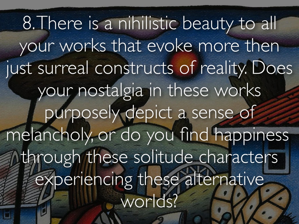 8. There is a nihilistic beauty to all your works that evoke more then just surreal constructs of reality. Does your nostalgia in these works purposely depict a sense of melancholy, or do you find happiness through these solitude characters experiencing these alternative worlds?