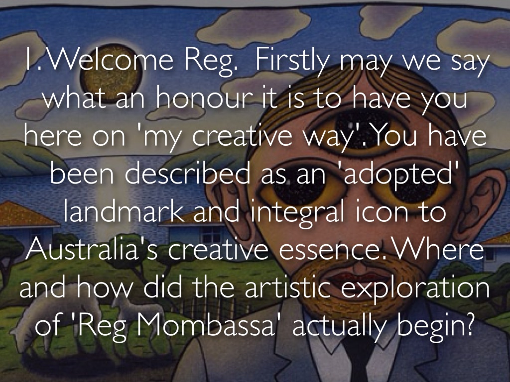 1. Welcome Reg. Firstly may we say what an honour it is to have you here on 'my creative way'. You have been described as an 'adopted' landmark and integral icon to Australia's creative essence. Where and how did the artistic exploration of 'Reg Mombassa' actually begin?