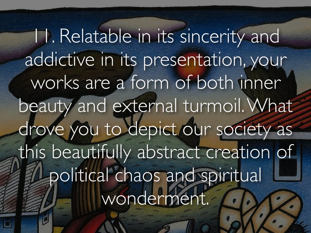 11. Relatable in its sincerity and addictive in its presentation, your works are a form of both inner beauty and external turmoil. What drove you to depict our society as this beautifully abstract creation of political chaos and spiritual wonderment.