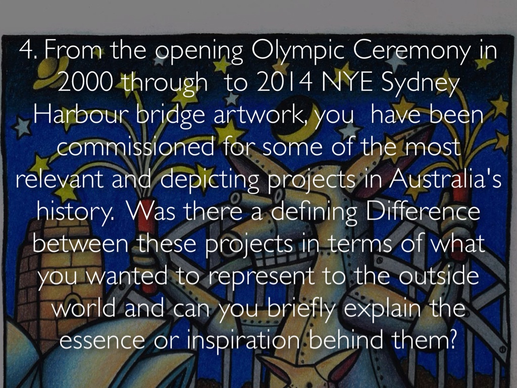 4. From the opening Olympic Ceremony in 2000 through to 2014 NYE Sydney Harbour bridge artwork, you have been commissioned for some of the most relevant and depicting projects in Australia's history. Was there a defining Difference between these projects in terms of what you wanted to represent to the outside world and can you briefly explain the essence or inspiration behind them?