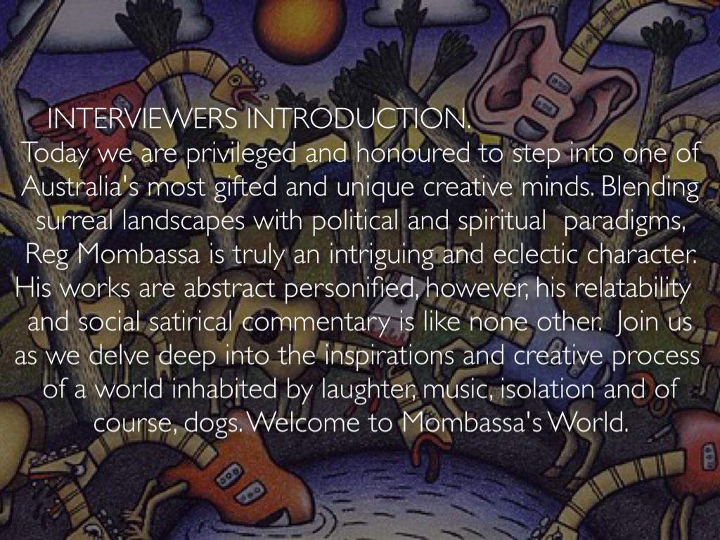 INTERVIEWERS INTRODUCTION. Today we are privileged and honoured to step into one of Australia's most gifted and unique creative minds. Blending surreal landscapes with political and spiritual paradigms, Reg Mombassa is truly an intriguing and eclectic character. His works are abstract personified, however, his relatability and social satirical commentary is like none other. Join us as we delve deep into the inspirations and creative process of a world inhabited by laughter, music, isolation and of course, dogs. Welcome to Mombassa's World.