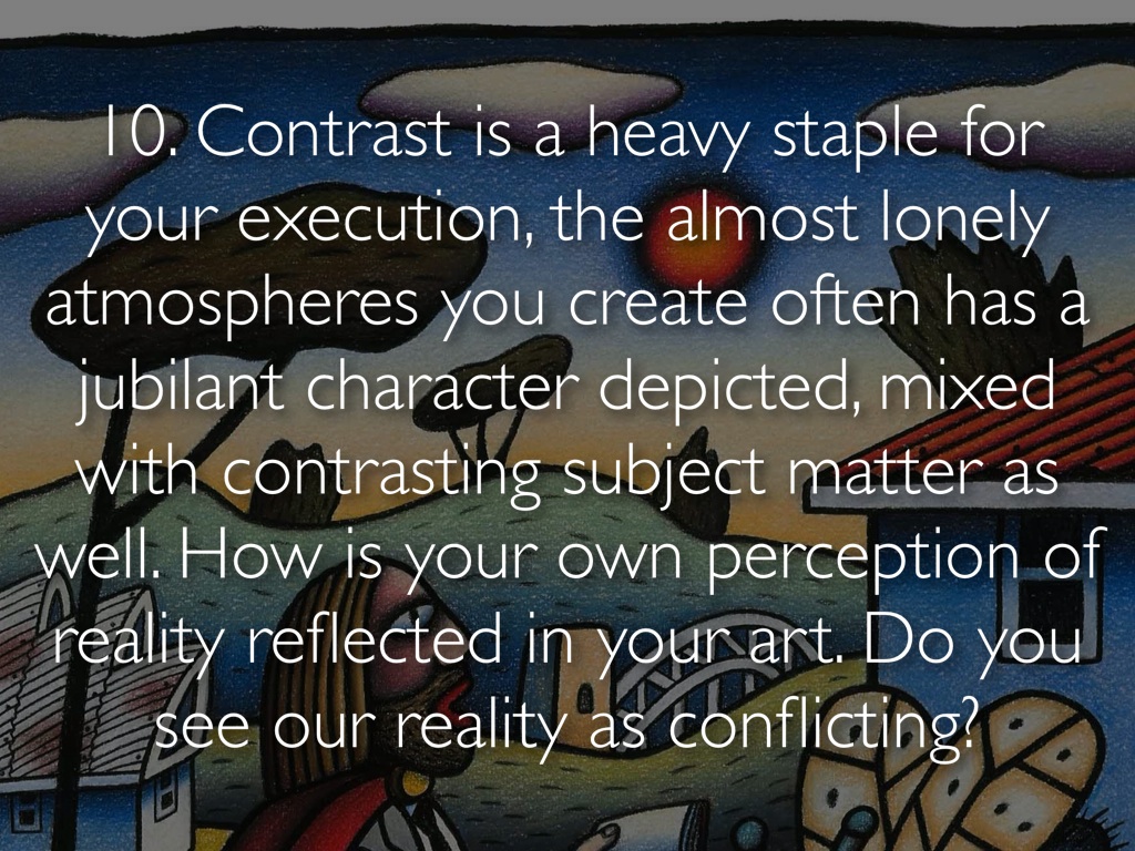 10. Contrast is a heavy staple for your execution, the almost lonely atmospheres you create often has a jubilant character depicted, mixed with contrasting subject matter as well. How is your own perception of reality reflected in your art. Do you see our reality as conflicting?