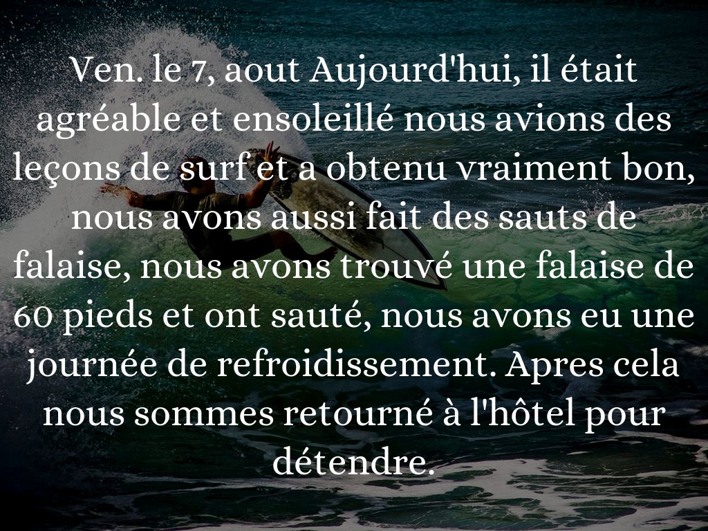 Ven. le 7, aout Aujourd'hui, il était agréable et ensoleillé nous avions des leçons de surf et a obtenu vraiment bon, nous avons aussi fait des sauts de falaise, nous avons trouvé une falaise de 60 pieds et ont sauté, nous avons eu une journée de refroidissement. Apres cela nous sommes retourné à l'hôtel pour détendre.